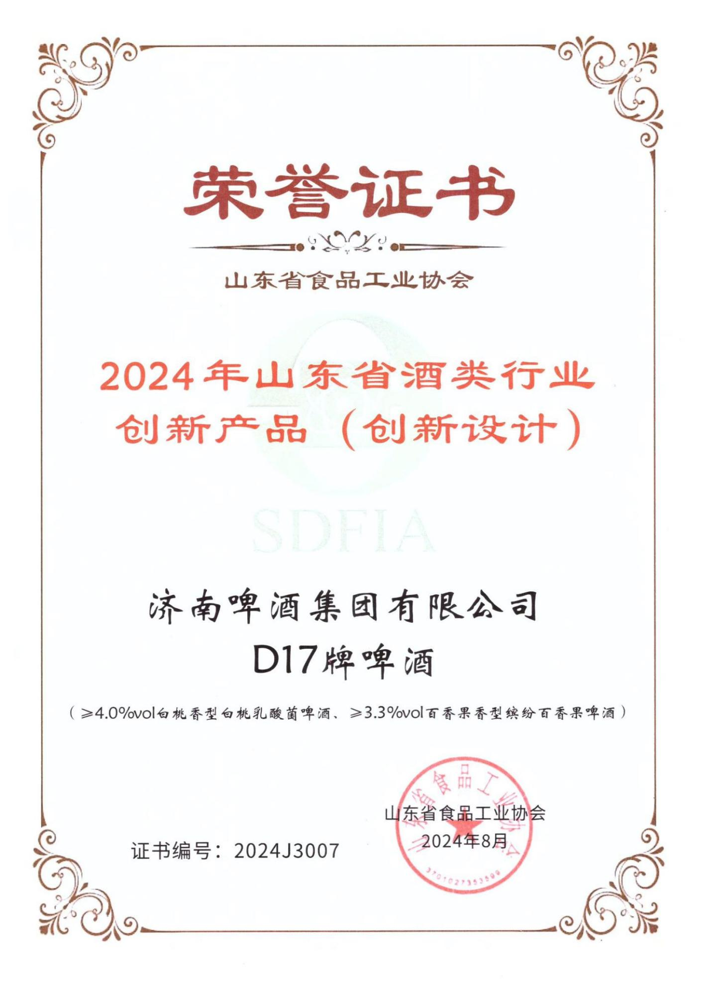 近日,在山东省食品工业协会举办的“2024年全省食品行业评委年会暨感官质量评价会”上,鲁商投资旗下济啤集团D17精酿啤酒凭借其卓越的品质和口感,荣获本届感官质量星级产品评价的最高荣誉——“5星级产品”以及“创新产品”奖。