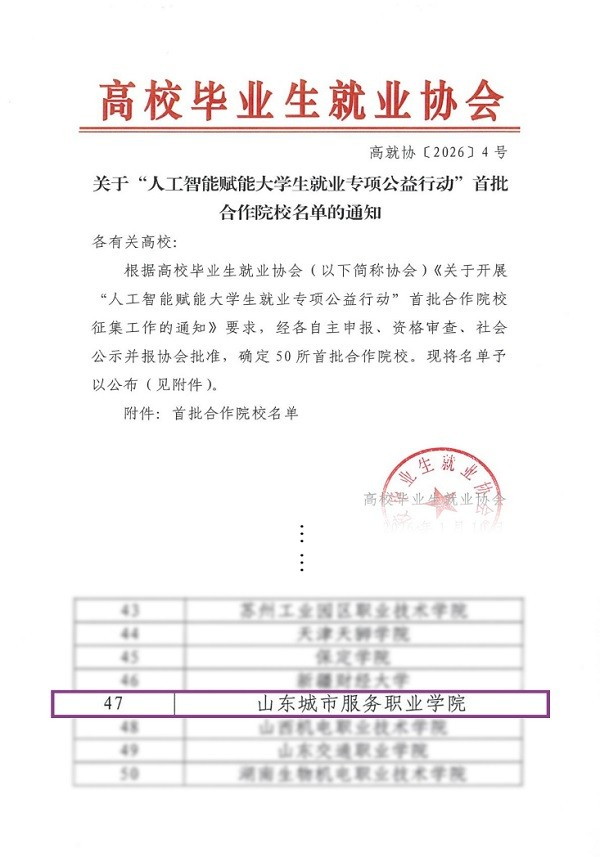 近日,高校毕业生就业协会正式公布“人工智能赋能大学生就业专项公益行动”首批合作院校名单,山东城市服务职院凭借扎实的就业工作基础、创新的就业服务模式及显著的就业工作成效,成功入选,成为全国首批、区域领先的获选院校之一。