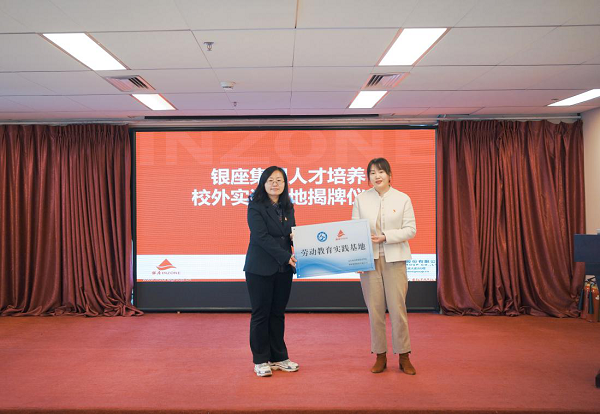 在银座集团总部会议室,银座集团综合部部长颜娜和工商管理学院党总支副书记朱颖共同为校外劳动实践基地揭牌,同学们观看了银座宣传片《我是银座》,了解银座集团人才招聘和培养计划。