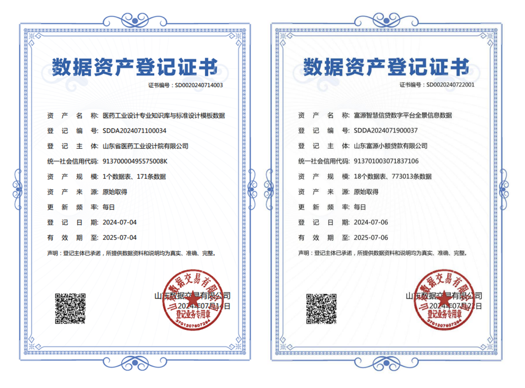 近日,省医工院、鲁商产融所属富源小贷获颁各自首张数据资产登记证书,标志着鲁商集团在积极响应山东省“数字强省”战略,数据资产创新应用领域取得新突破。
