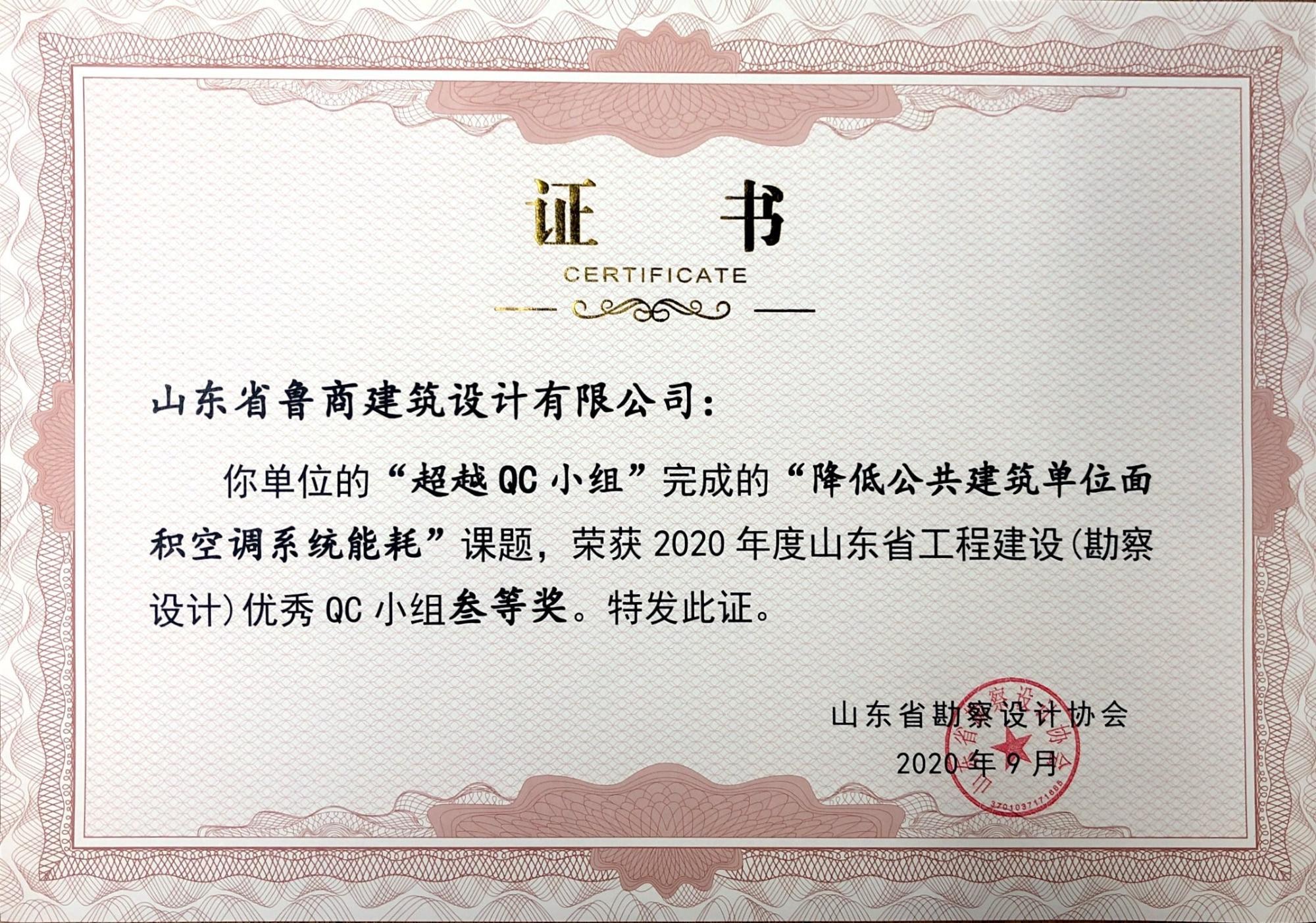 近日,由山东省勘察设计协会组织评选的2020年度山东省工程建设(勘察设计)优秀QC小组获奖情况揭晓。经过专家评审,由鲁商发展所属山东省鲁商设计有限公司(简称鲁商设计院)超越QC小组申报的《降低公共建筑空调系统能耗》QC成果在404个申报成果中脱颖而出,获得2020年度山东省工程建设(勘察设计)优秀QC小组三等奖。