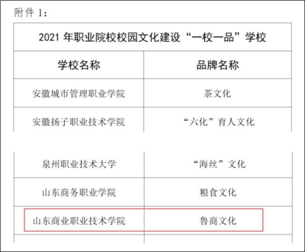 近日,教育部职业院校文化素质教育指导委员会公布2021年全国职业院校校园文化建设“一校一品”评选结果,山东商院申报的“鲁商文化”校园文化品牌成果成功入选。