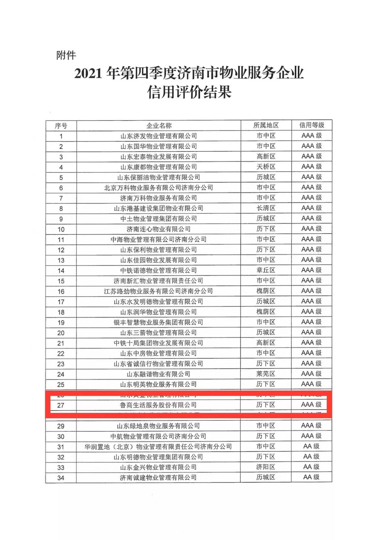 近日,济南市住房和城乡建设局公布了2021年第四季度全市物业服务企业信用评价结果,鲁商服务再次获评AAA级即最高级别信用企业。