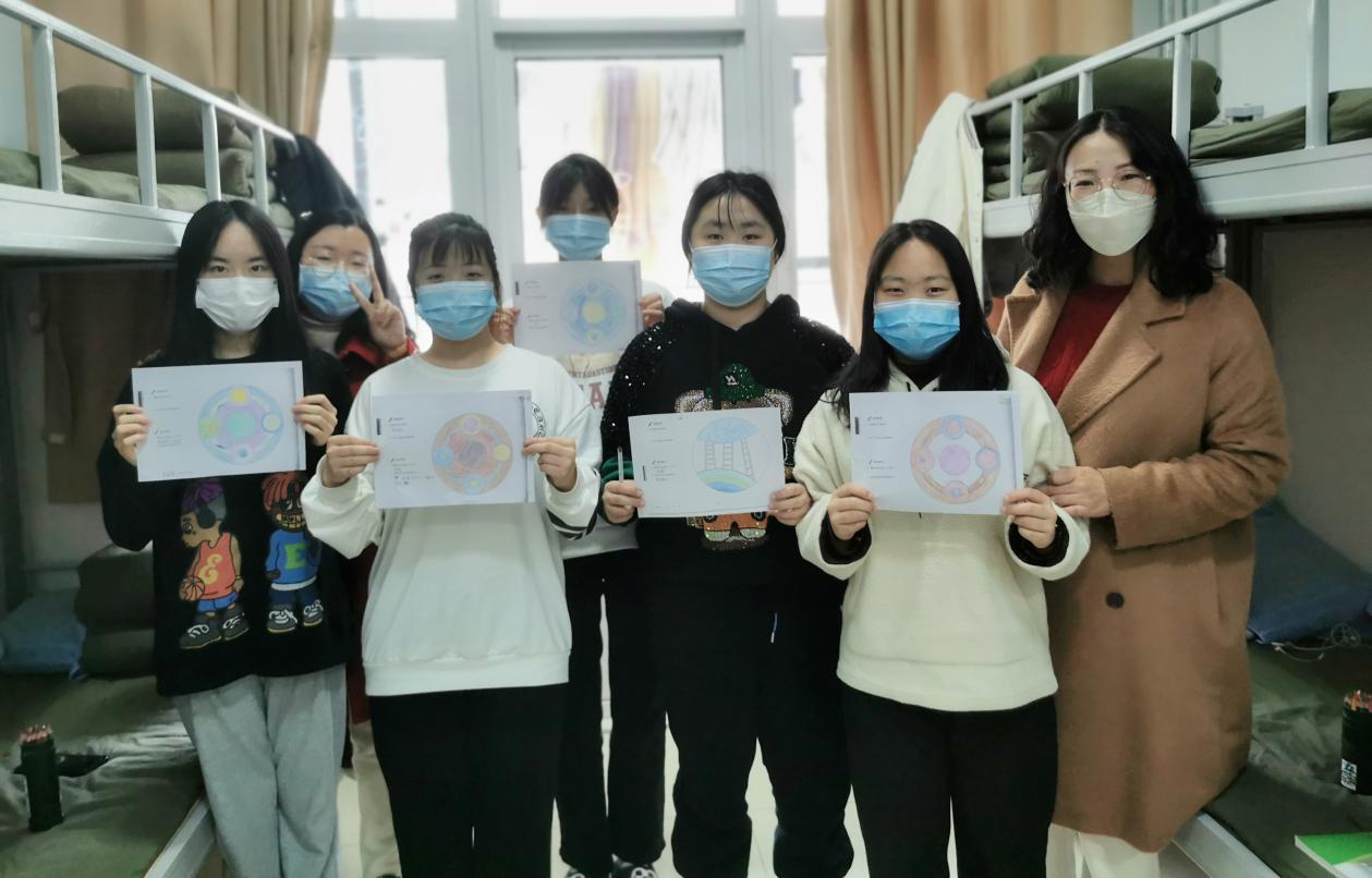 老师带着学生们一起做放松训练,感受近一周以来的心情,学生们用彩铅创作自己心目中的曼陀罗作品。