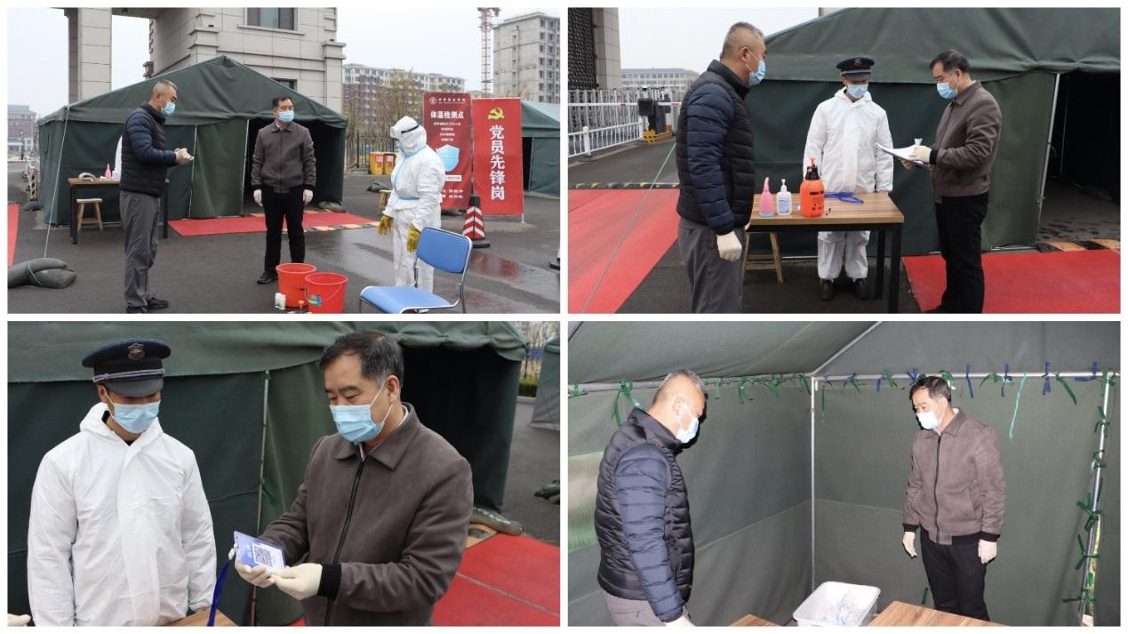 4月2日,齐鲁医药学院副院长杜敏带队对校门、临时留观点等区域进行疫情防控“四不两直”专项检查,安全保卫处负责人陪同。