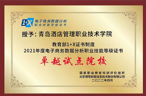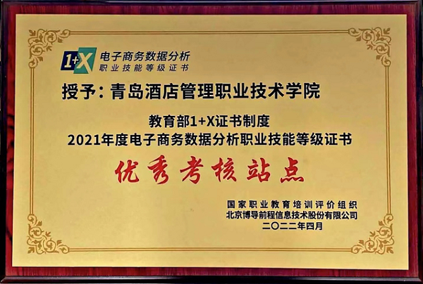 近日,在2021年度电子商务数据分析“1+X”证书试点工作表彰会暨岗课赛证融通育人模式线上研讨会上,青岛酒店学院荣获“1+X”电子商务数据分析职业技能等级证书“卓越试点院校”和“优秀考核站点”2项荣誉。