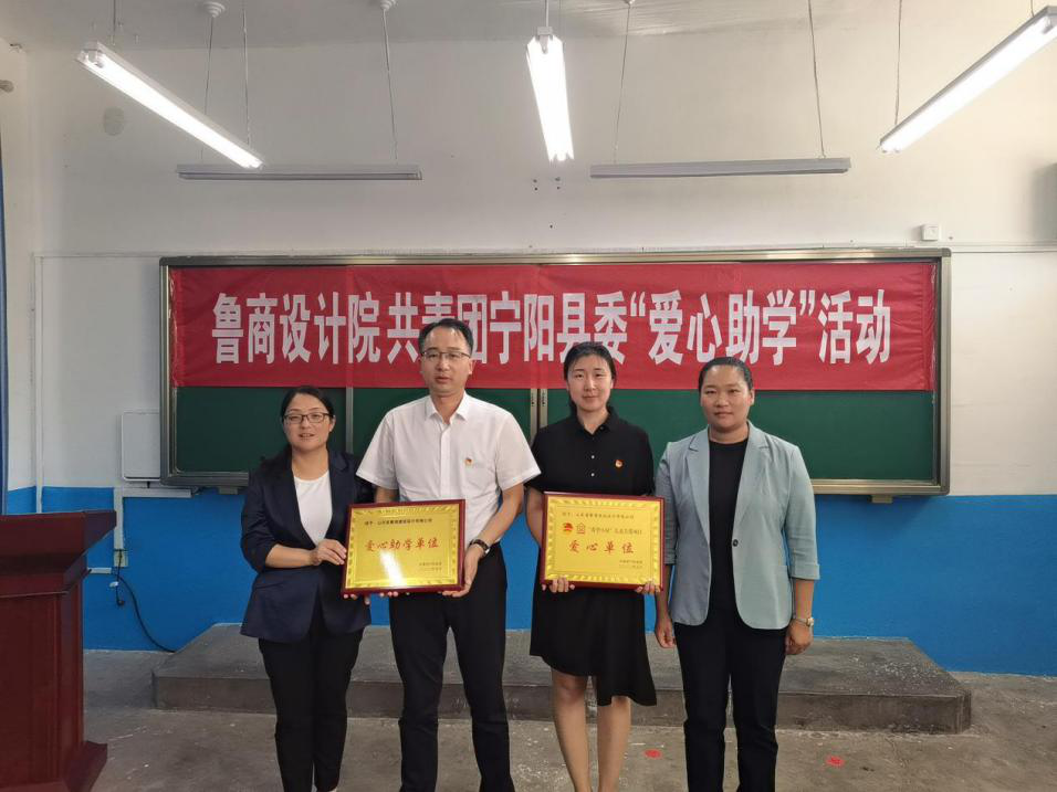 5月30日,鲁商服务设计院党支部联合宁阳团县委赴乡饮乡开展“爱心助学”活动,将支部党员、发展对象、入党积极分子及团员为10名困难学生捐献的奖学金送到乡饮乡韦周小学孩子手中,并为韦周小学和沙河小学捐献课外书籍。宁阳县委副书记苏伟丽表示,希望双方继续加强沟通交流,在城市更新、乡村振兴等业务领域深度合作,实现互利共赢。宁阳团县委授予鲁商服务设计院“希望小屋”儿童关爱项目“爱心单位”、“爱心助学单位”等荣誉称号。