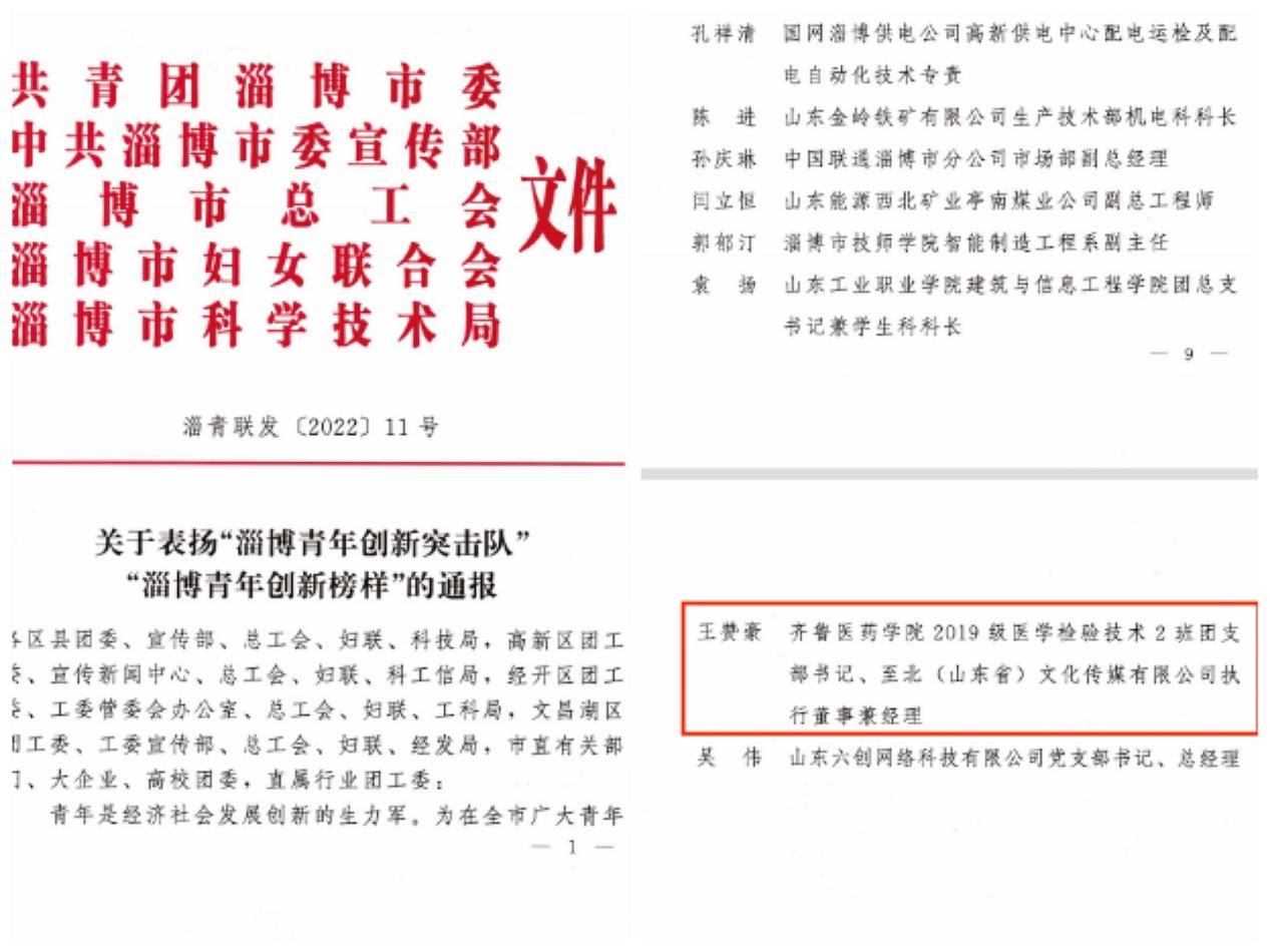 近日,淄博团市委、淄博市委宣传部等部门发布《关于表扬“淄博青年创新突击队”“淄博青年创新榜样”的通报》,齐鲁医药学院2019级医学检验技术本科2班学生王赞豪获评“淄博青年创新榜样”荣誉称号。