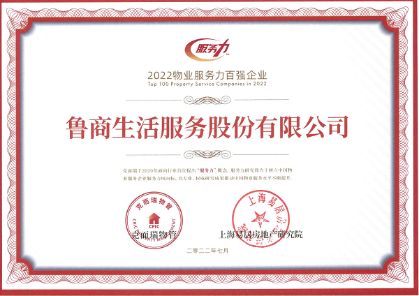 7月29日,由浙江省物业管理协会指导、克而瑞物管主办的“2022中国物业服务力百强峰会”在杭州召开,鲁商服务荣膺“2022物业服务力百强企业”称号。
