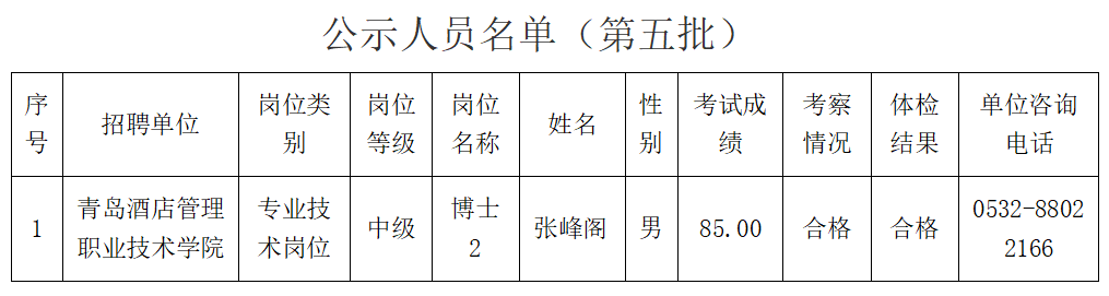 根据省委组织部、省人力资源和社会保障厅《关于印发2023年度省属事业单位公开招聘工作实施方案的通知》(鲁人社发〔2022〕23号)和省属事业单位公开招聘有关政策规定,按照岗位招聘计划,青岛酒店管理职业技术学院组织完成了公开招聘考试、考察、体检等工作,现对该单位第五批拟聘用人员进行公示。公示期为7个工作日,自2023年8月29日至2023年9月6日(不含节假日)。公示期间,如对公示人选有异议,请向山东省商业集团有限公司人力资源部反映。反映问题要实事求是,并告知真实姓名及联系方式。