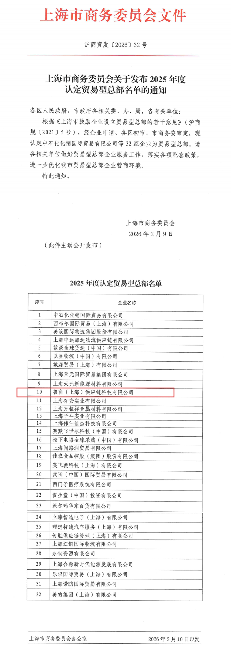 近日,上海市商务委员会正式公布了2025年度认定的32家贸易型总部名单,鲁商(上海)供应链科技有限公司凭借稳健的业务基础、良好的行业积淀与成熟的综合服务能力成功入选。