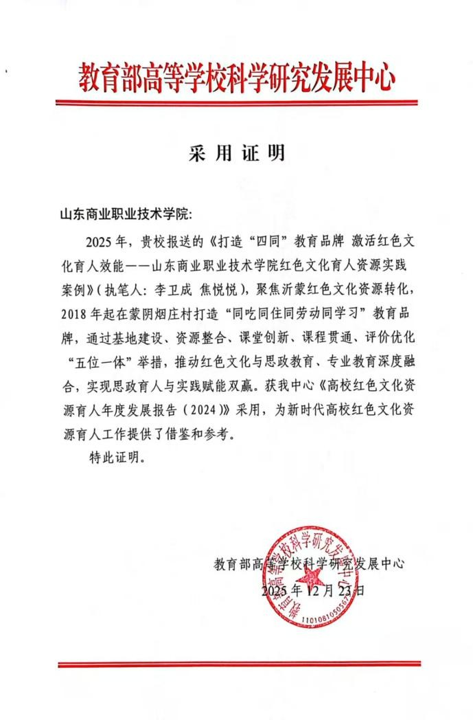 近日,山东商职学院报送的《打造“四同”教育品牌 激活红色文化育人效能——山东商业职业技术学院红色文化育人资源实践案例》成功入选教育部高等学校科学研究发展中心《高校红色文化资源育人年度发展报告(2024)》,为新时代高校红色文化资源育人工作提供了借鉴和参考。