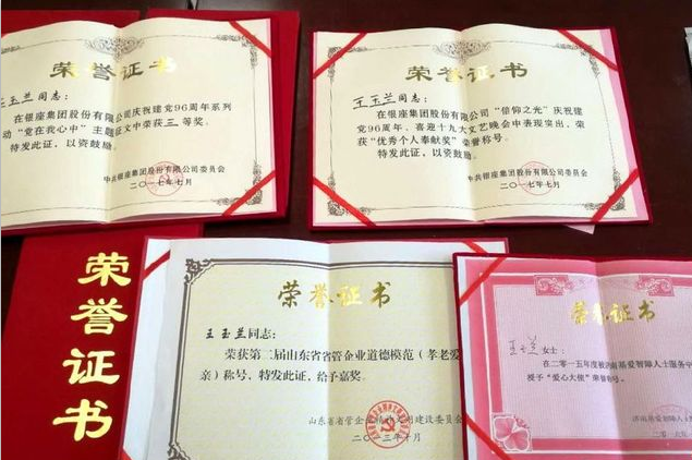 2013年,王玉兰荣获了“第二届山东省省管企业道德模范”(孝老爱亲)称号。能获得此荣誉,不单单是因为伟大的母爱感动评委,还因为她是左邻右舍称赞的孙家好儿媳。1998年7月,72岁的公公因肠癌住进了医院,因第一次手术不成功造成肠瘘,连续进行了四次大手术,在医院住了将近一年的时间。