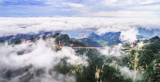 据了解,目前世界上较长的悬索桥有瑞士的欧洲之桥(494米)、德国的“泰坦-RT”步行悬索桥(458米)、俄罗斯的索契天空公园桥(439米)、中国湖南张家界玻璃桥(430米)。而银座天蒙景区的人行悬索桥全长505.5米,在被群山环绕的天蒙景区里,它横跨两座山峰,凌空而起,是连接玉皇宫和望海楼两个重要景点的交通要道。该人行索桥的建成避免了游客穿过深达143米的娄子沟,节约40分钟的行程。