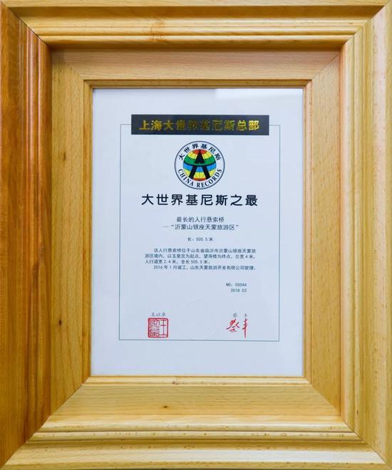日前,沂蒙山银座天蒙旅游区的“网红景点”——人行悬索桥通过大世界基尼斯总部权威认证,获得“大世界基尼斯之最”证书。这标志着天蒙山全长505.5米的人行悬索桥成功入选大世界基尼斯之最,被确认为最长人行悬索桥。