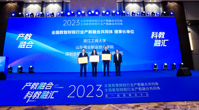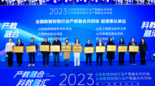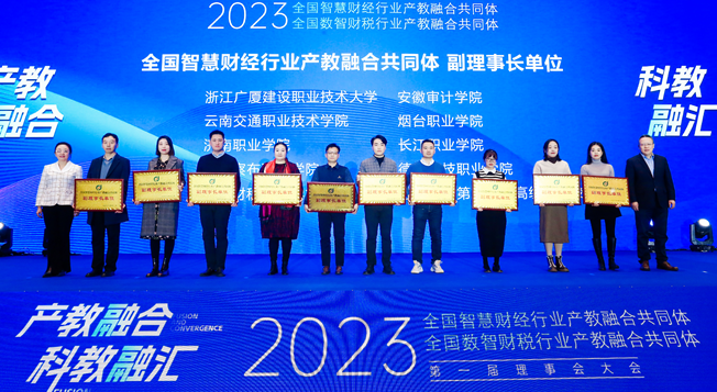 大会通过了两个共同体章程和第一届理事会名单。启动仪式上,与会领导为全国智慧财经行业产教融合共同体和全国数智财税行业产教融合共同体的理事长单位、副理事长单位、常务理事单位授牌。
