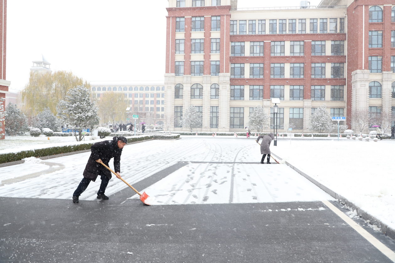 齐鲁医药学院后勤服务人员提早到位、坚守岗位,按照事先划分责任区域,进行人工铲雪除雪作业,党员干部冲锋在前,压紧压实工作责任,在上课前完成主要道路清扫工作,全力保障师生出行通畅。