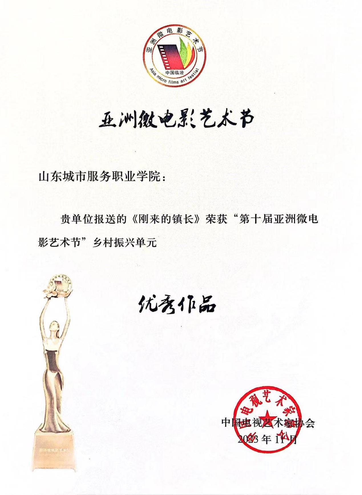 近日,第十届亚洲微电影艺术节举行,由山东城市服务职院出品的短片《刚来的镇长》在众多优秀作品中脱颖而出,荣获乡村振兴单元优秀作品。