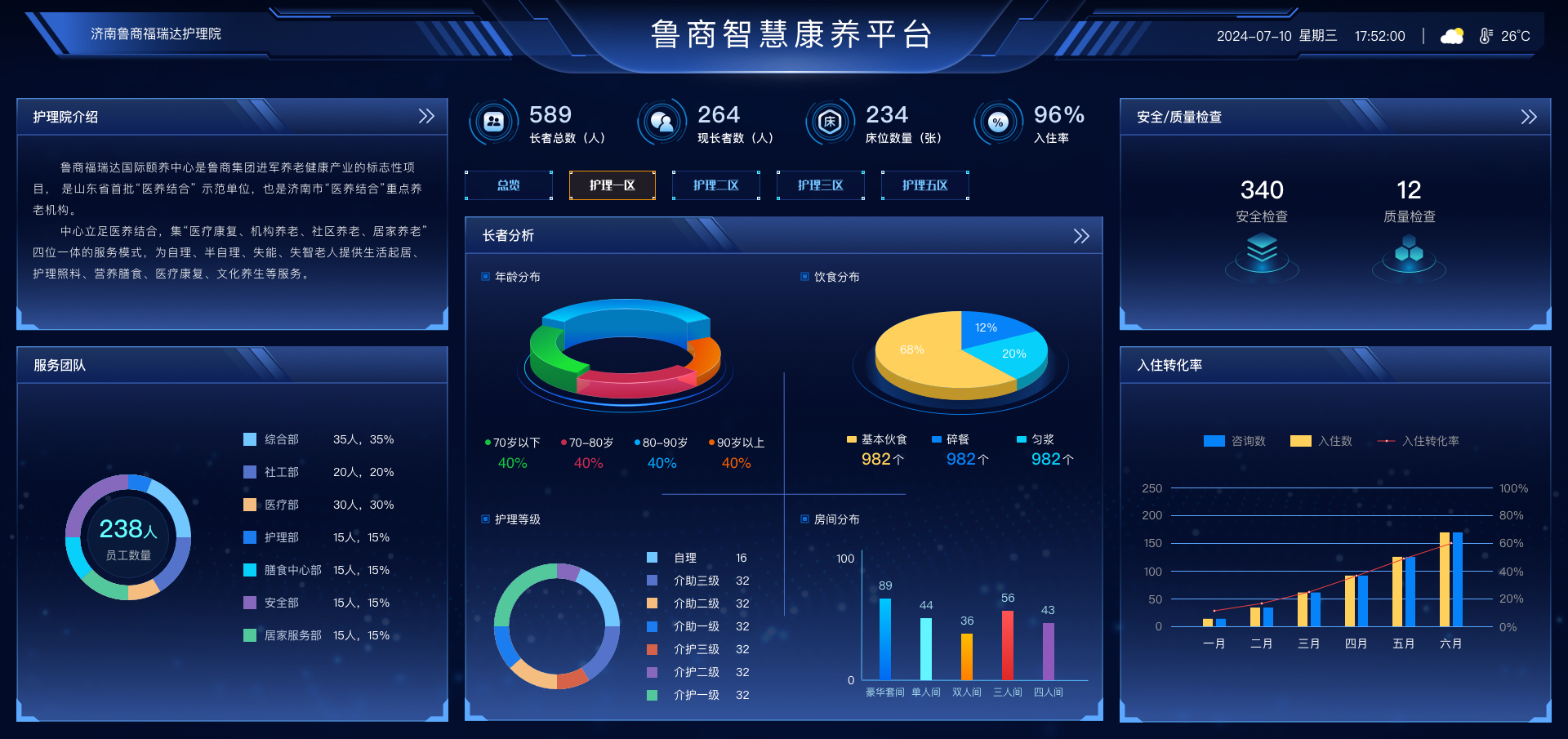“鲁商智慧康养院务管理平台”由鲁商产投所属鲁商福瑞达健康公司联合鲁商科技共同打造,是基于养老服务领域数字化转型需求,以济南鲁商福瑞达护理院咨询、入住、护理、医疗、评估、膳食等养老服务场景为蓝本,研发的一款数字化智慧康养服务平台。通过推动云计算、大数据、物联网等数字化技术在养老服务领域的融合创新和多场景应用,实现对长者身体状况数字化管理以及养老机构护理资源的优化配置,从而实现多层次、个性化养老需求的一站式护理服务,提升服务质效。