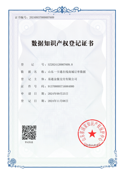 本次入表的“山东一卡通在线商城订单数据”基于公司权属单位易通金服沉淀的海量平台运营数据,鲁商科技通过深度清洗加工、合规确权、质量评价等,形成高质量数据集,并顺利获得数据资源、数据资产、数据知识产权3类登记证书。